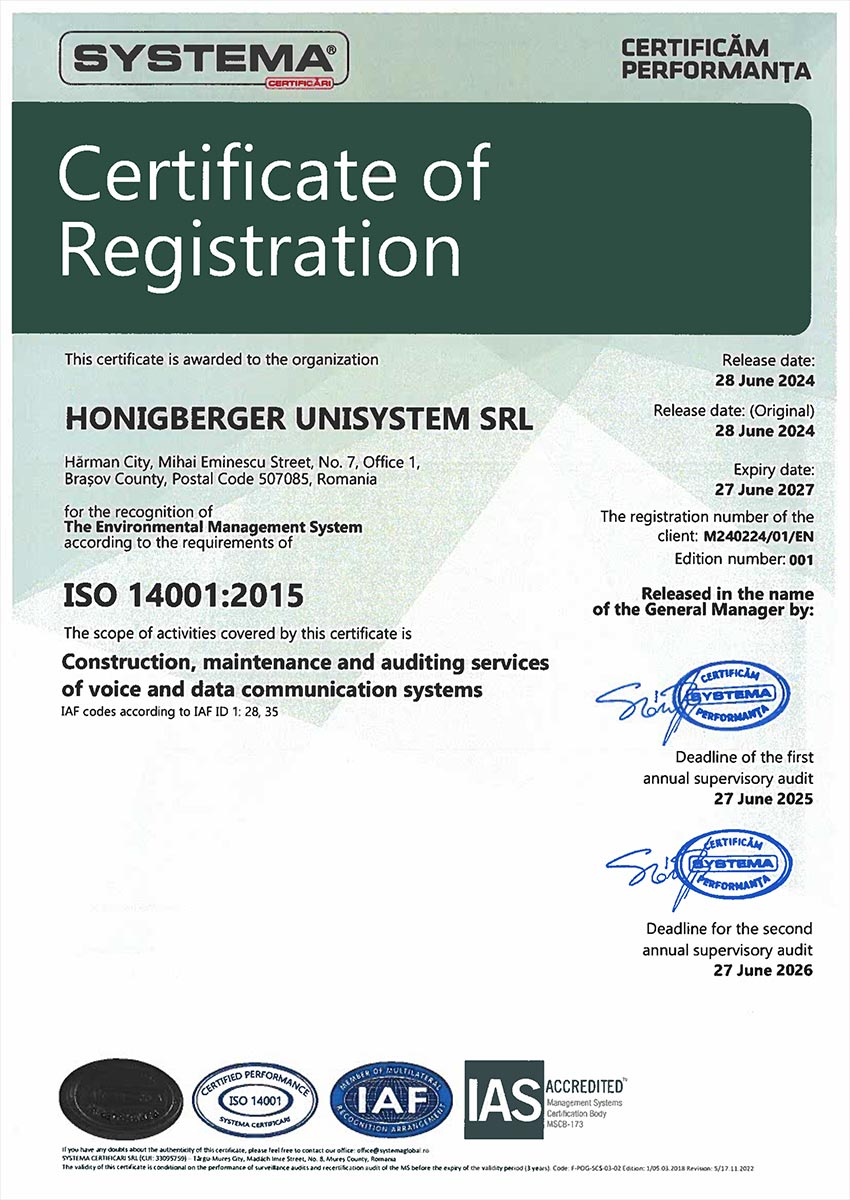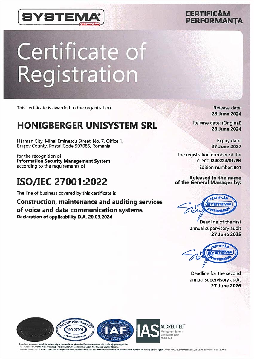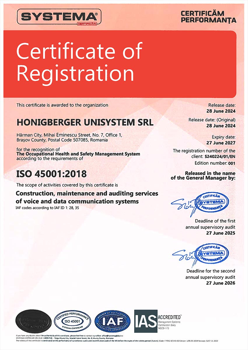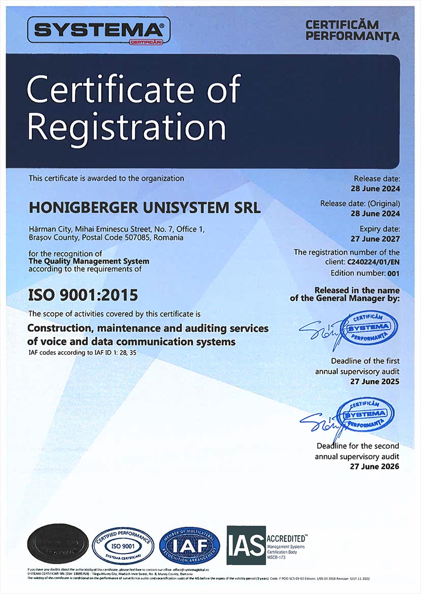 HONIGBERGER UNISYSTEM își propune dezvoltarea constantă și optimizarea continuă, pentru a putea oferi clienților noștri servicii integrate, la standarde de înaltă calitate.